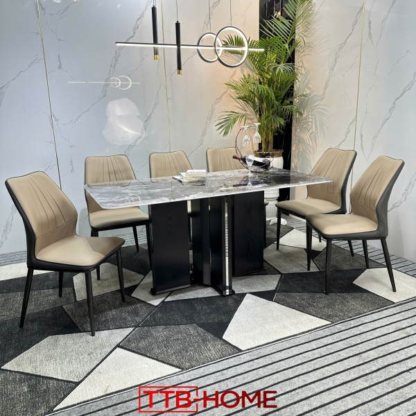 Bộ bàn ăn này là hiện thân của phong cách Luxury Modern, nơi mỗi chi tiết đều được chăm chút tỉ mỉ từ vật liệu đến thiết kế, mang lại một không gian ẩm thực đậm chất nghệ thuật và đầy tiện nghi.