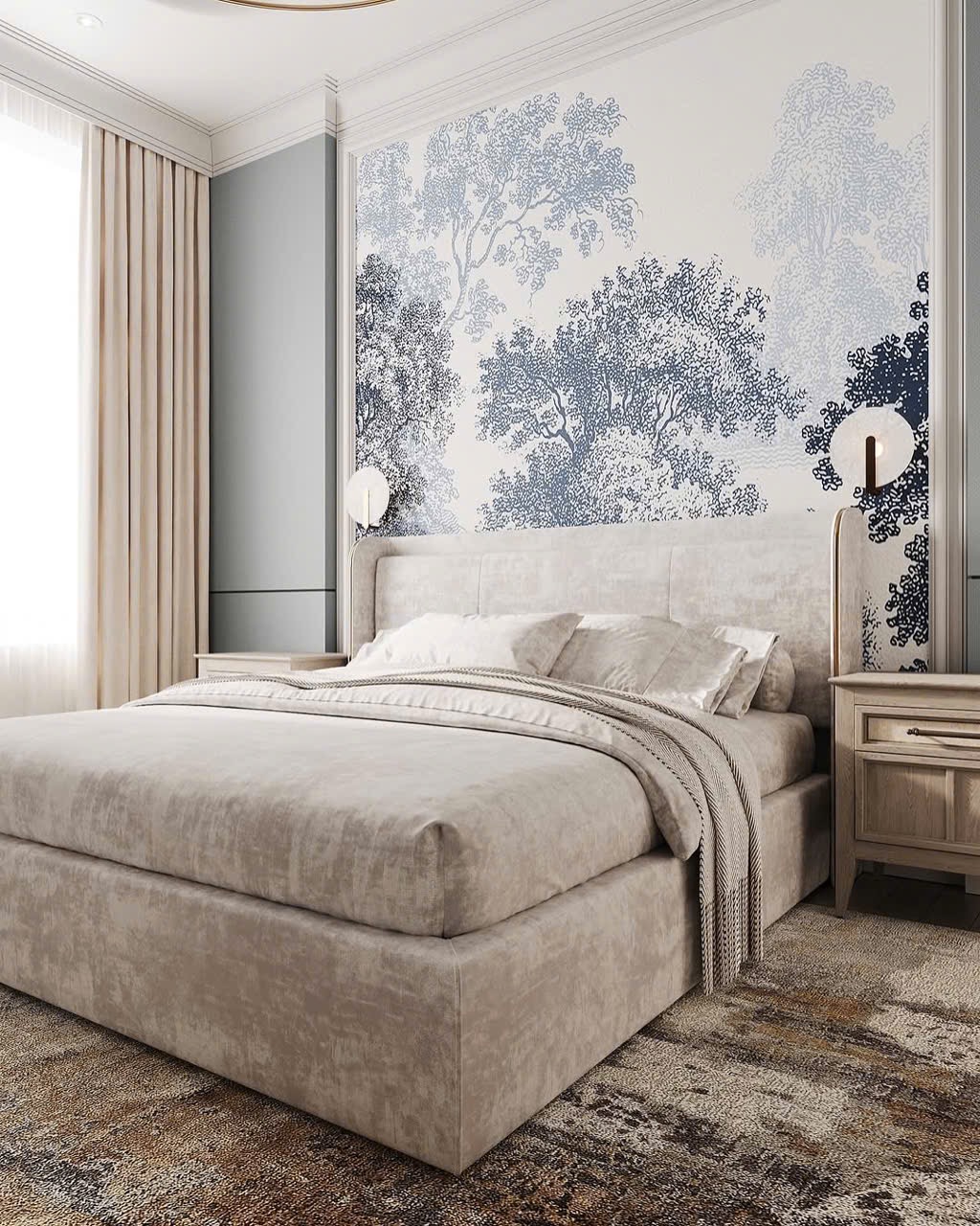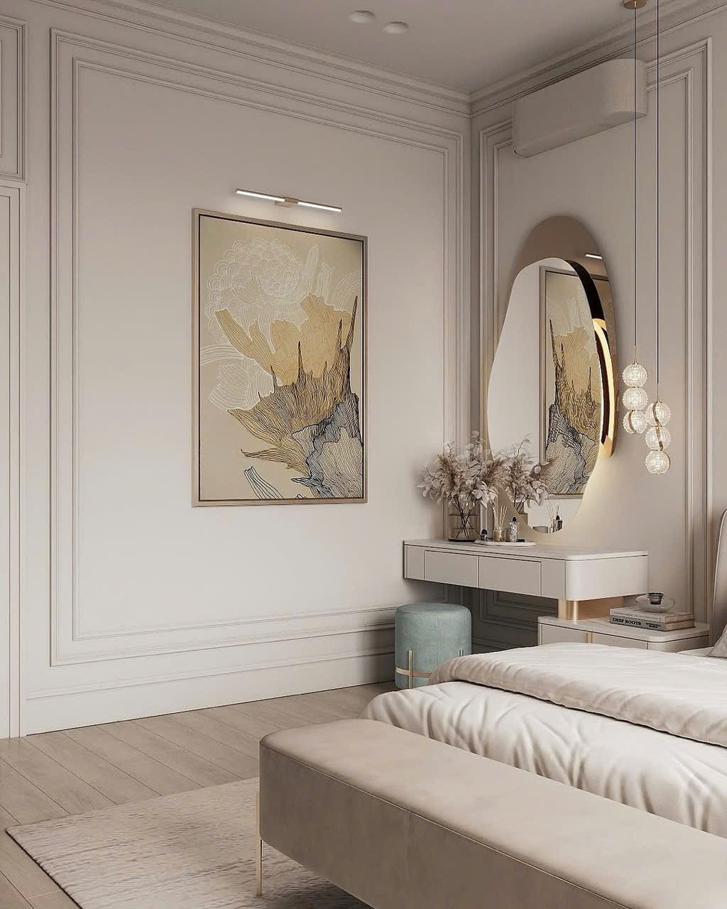 Đế giường được thiết kế thông minh, ôm sát mặt đất hoặc có chân thấp tùy theo yêu cầu, giúp dễ vệ sinh và tăng tính thẩm mỹ.