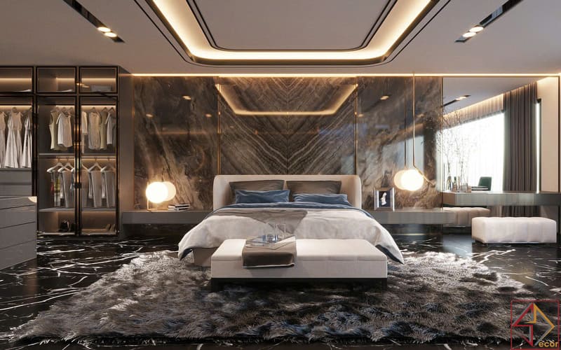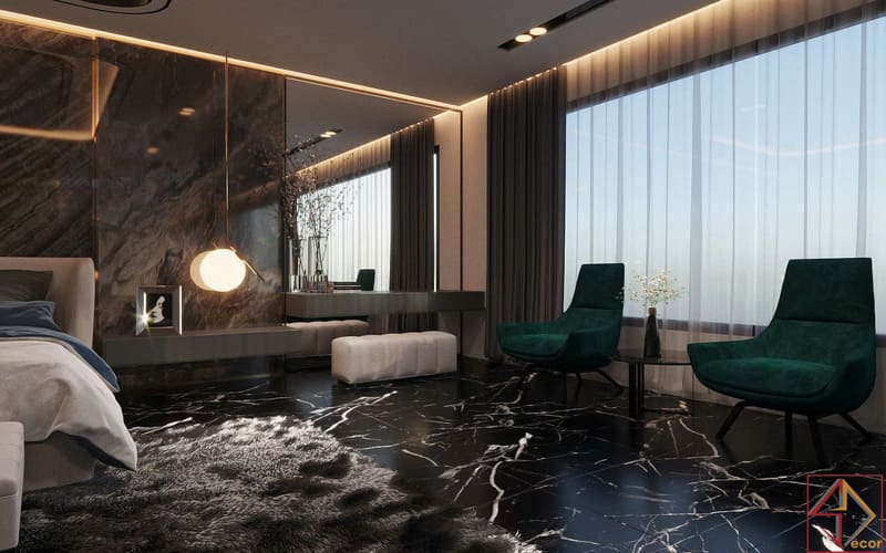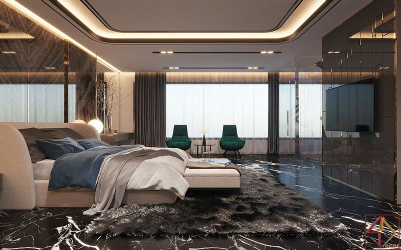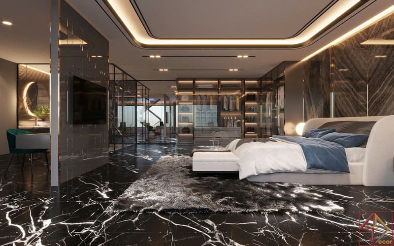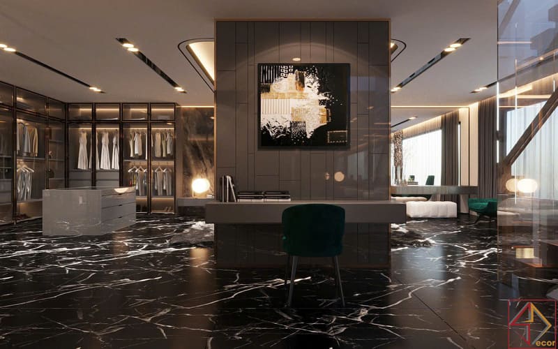 Sự tương phản mạnh mẽ giữa nét cổ điển và hiện đại, kết hợp với việc sử dụng vật liệu cao cấp và ánh sáng nghệ thuật để tạo nên một không gian sống đẳng cấp, sang trọng và đầy cá tính.