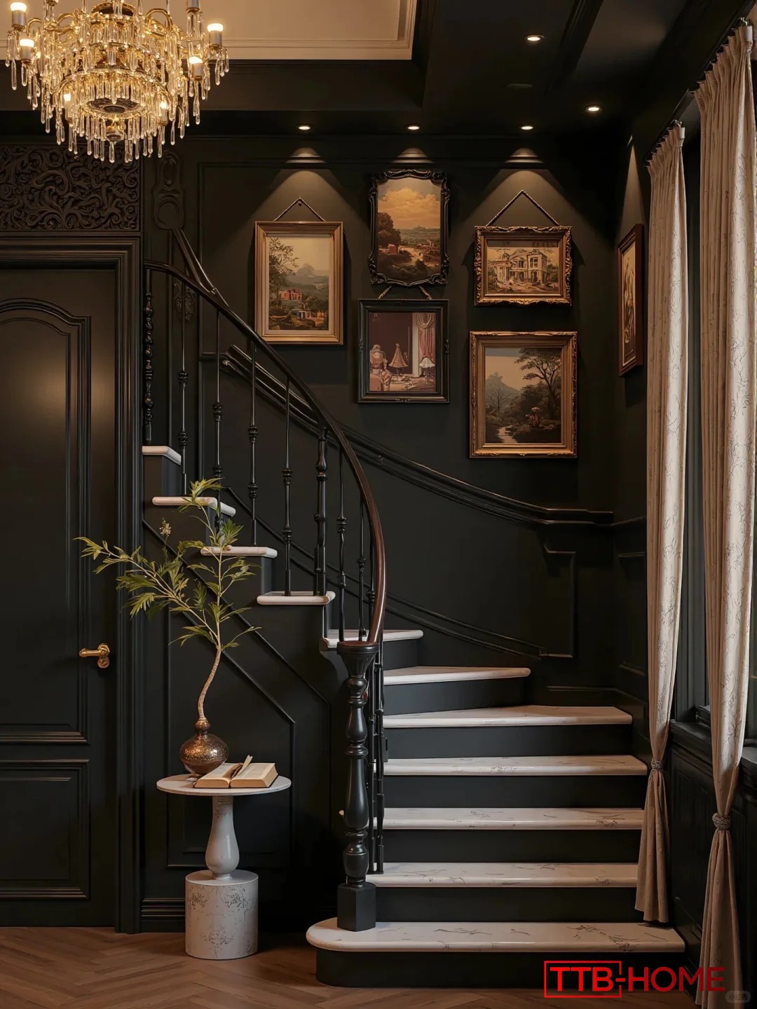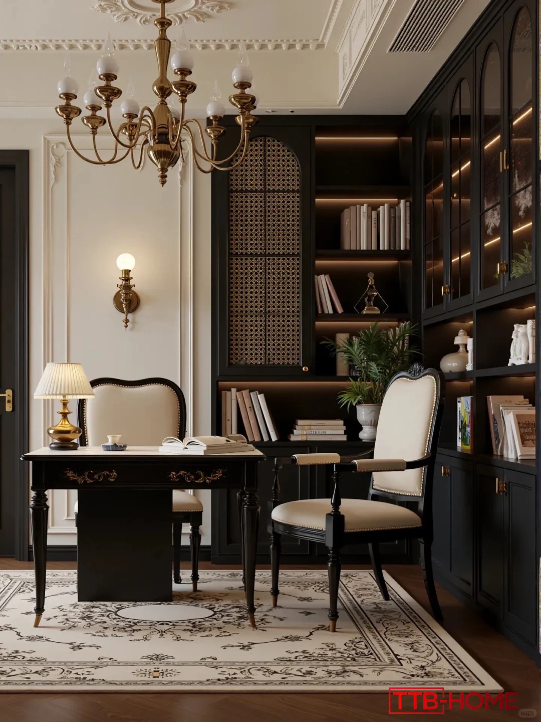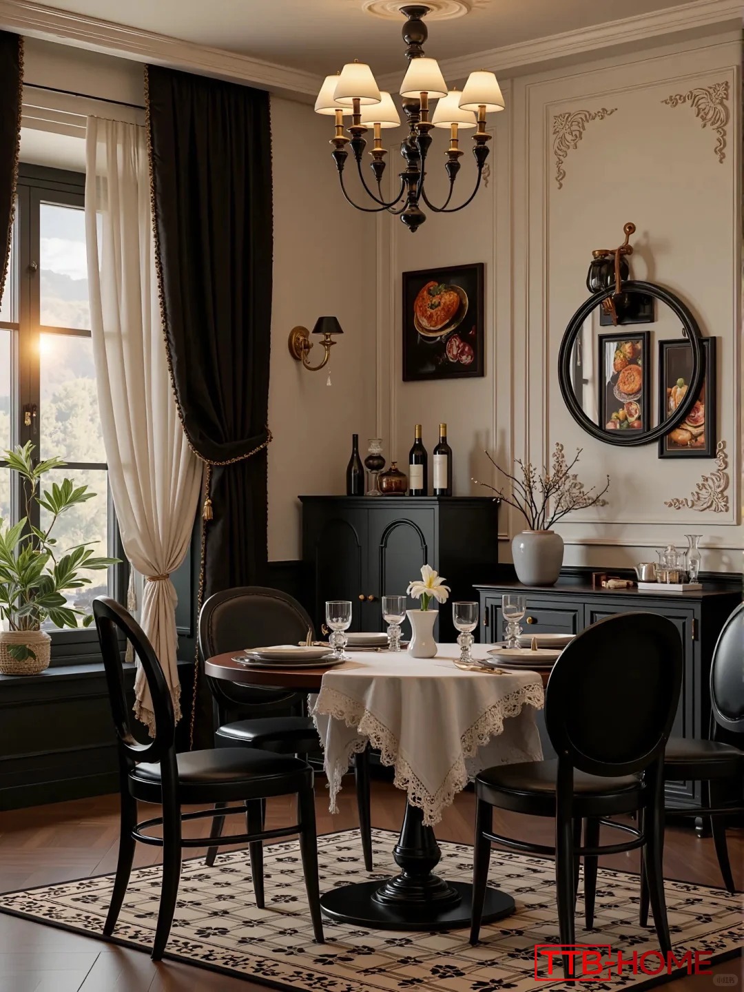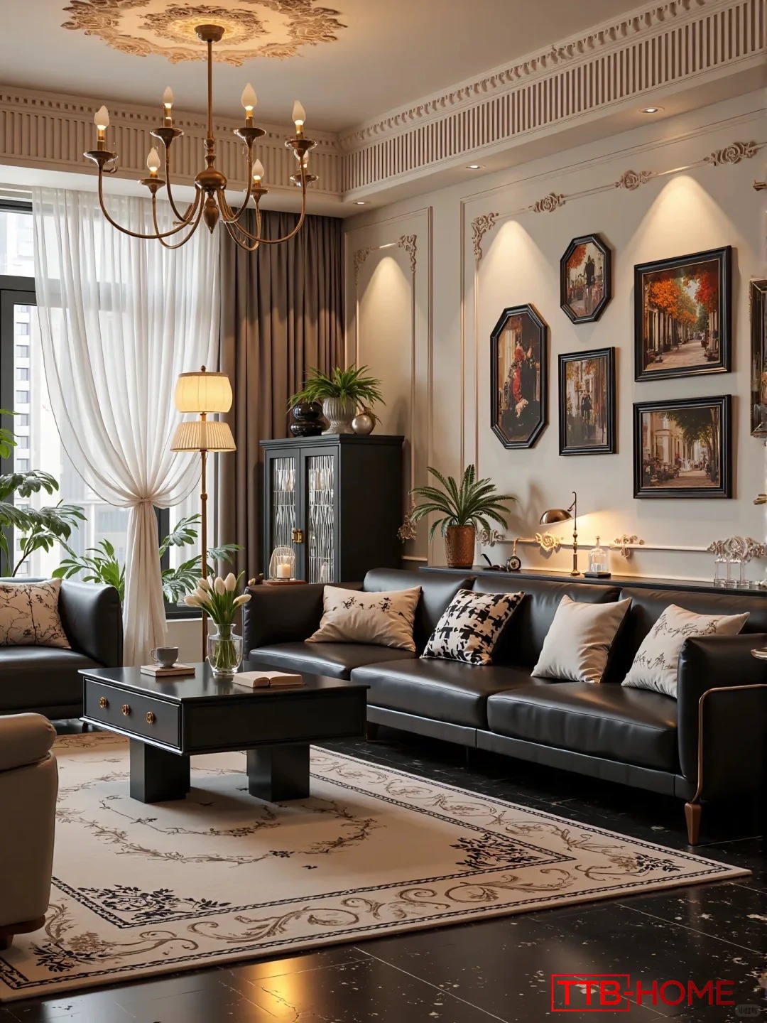 • Phòng khách là nơi đón ánh sáng tự nhiên, kết hợp sofa da cao cấp, bàn trà đen nhấn nhá ánh vàng, và hệ thống tranh treo tường nghệ thuật – mang đậm hơi thở cổ điển Pháp.