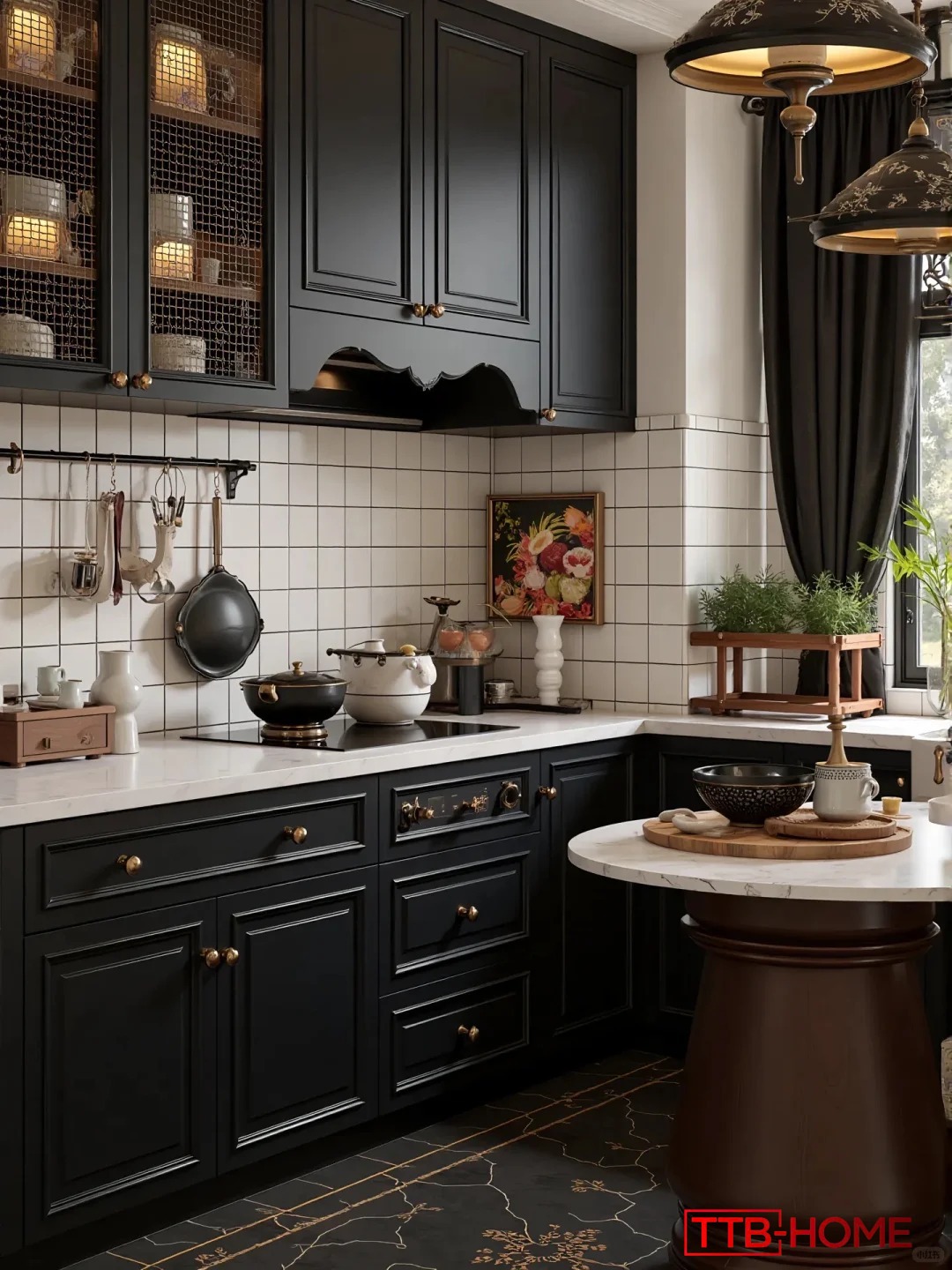 • Phòng bếp và bàn ăn lại là điểm nhấn ấm cúng với gam màu trầm, hệ tủ bếp kiểu dáng cổ điển, cùng ánh đèn vàng dịu nhẹ, giúp mỗi bữa ăn trở thành khoảnh khắc kết nối đầy cảm xúc.