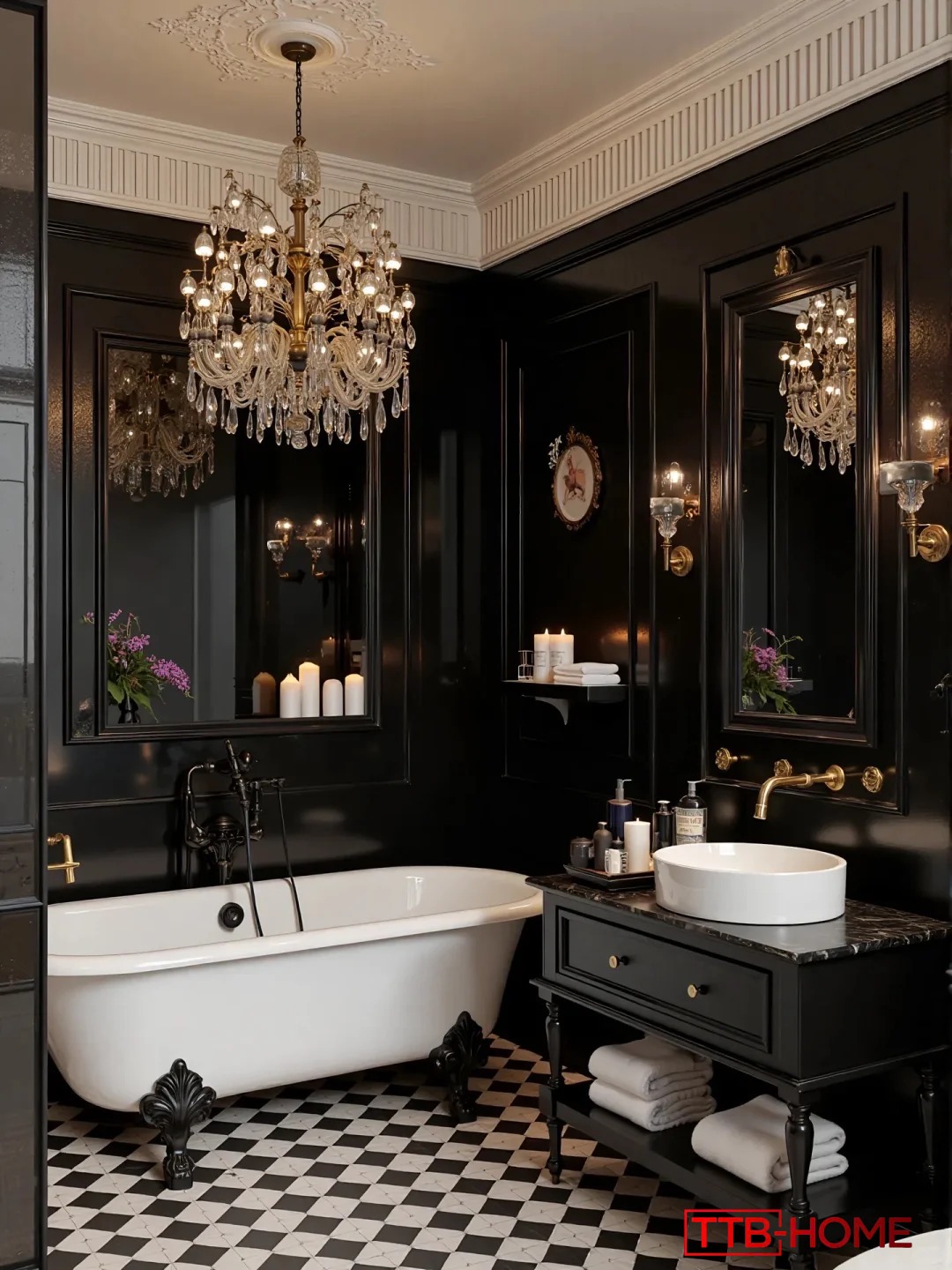 • Phòng tắm mang hơi hướng hoàng gia với gạch caro trắng đen, bồn tắm chân sư tử và đèn chùm pha lê – tái hiện không gian thư giãn đẳng cấp châu Âu.