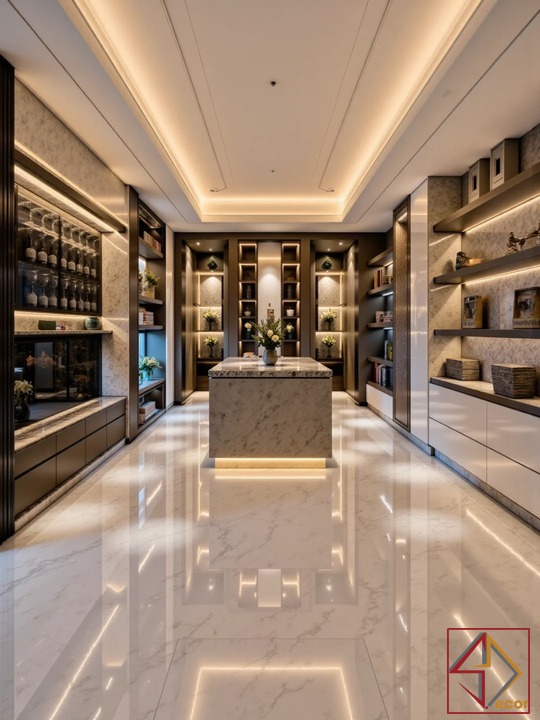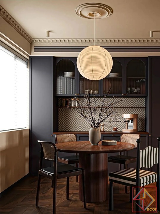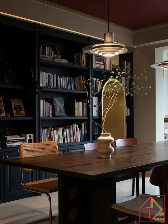 Góc Cá Tính (Cá Tính/Retro): Dành cho khu vực phòng làm việc, phòng đọc sách hoặc bàn ăn phụ. Tủ sách kịch trần màu đen hoặc xanh Navy kết hợp với các chi tiết mây, tre, nứa hoặc giấy dán tường họa tiết hình học tạo nên sự phá cách, độc đáo và đầy nghệ thuật.