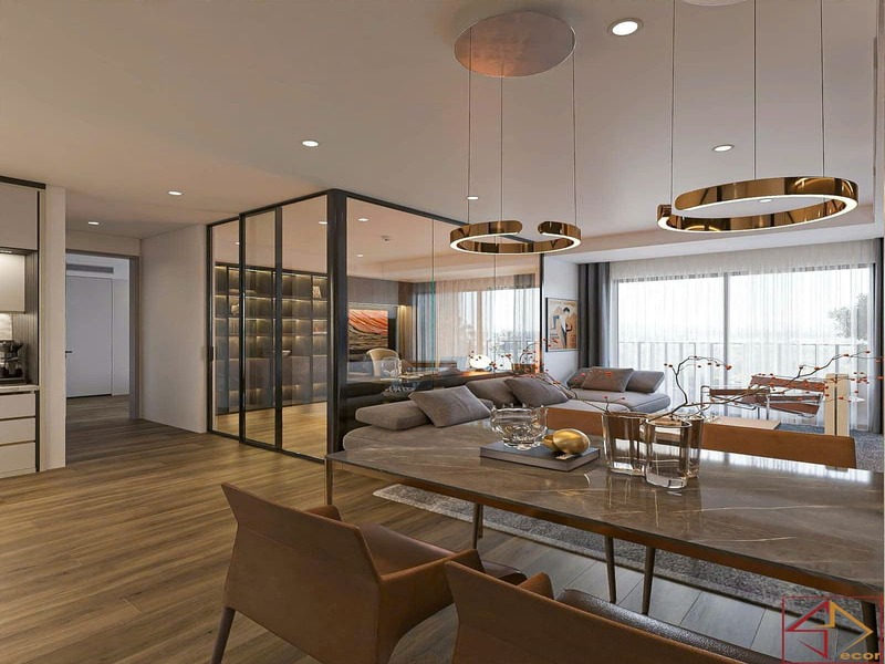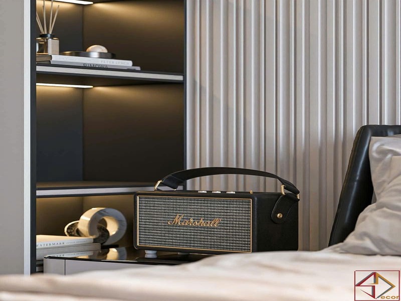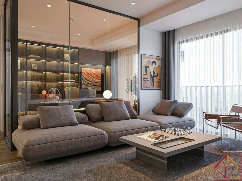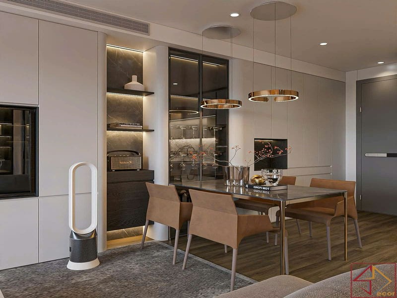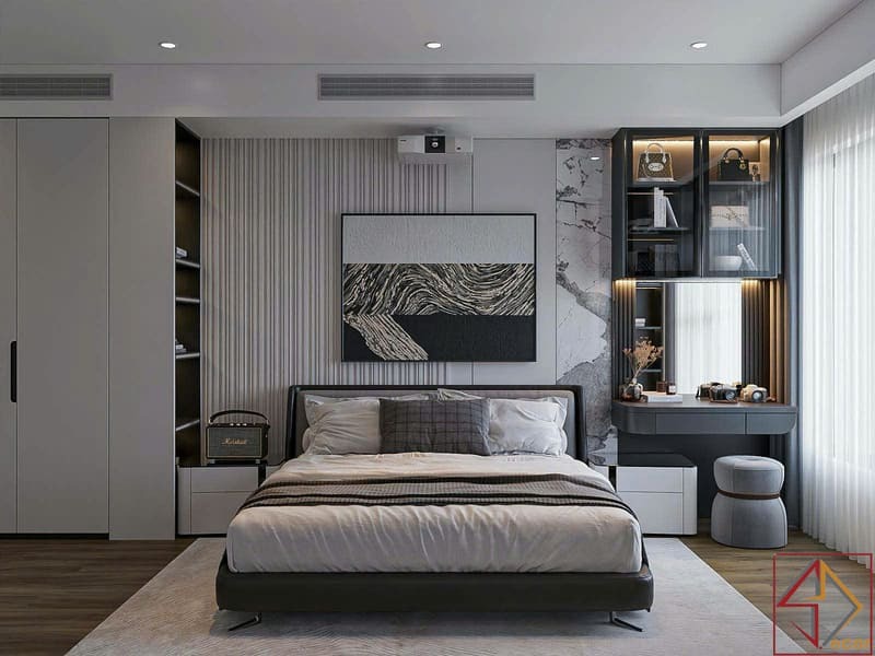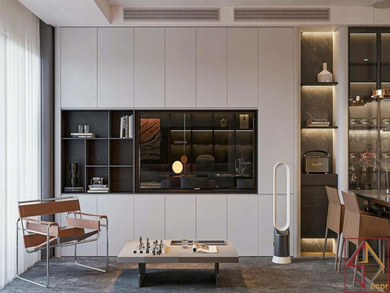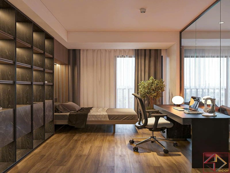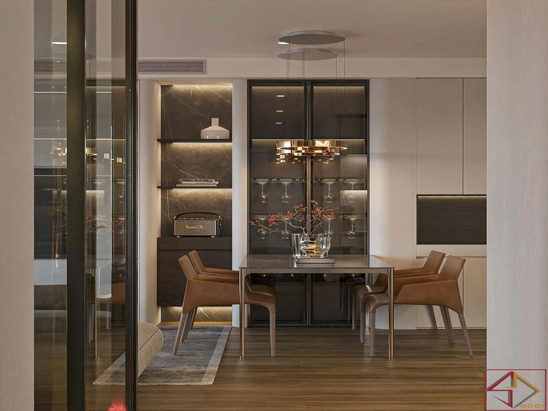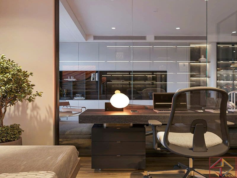 • Thiết kế thông minh: Kệ tủ âm tường trong phòng khách và phòng ngủ không chỉ tăng không gian lưu trữ mà còn tạo điểm nhấn trang trí. Việc sử dụng vách kính phân chia khu vực làm việc/học tập vừa đảm bảo sự riêng tư tương đối, vừa giữ được sự thông thoáng và kết nối thị giác giữa các không gian.
