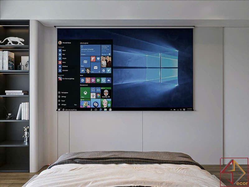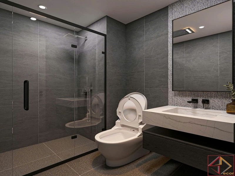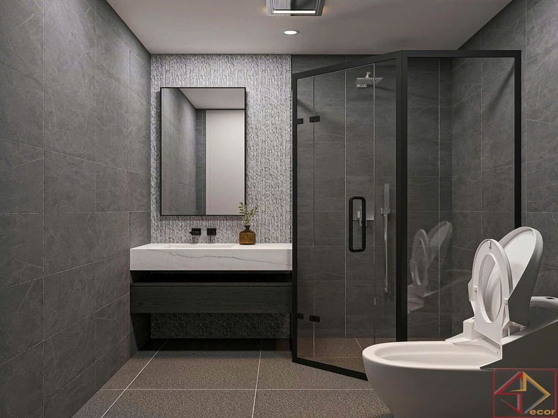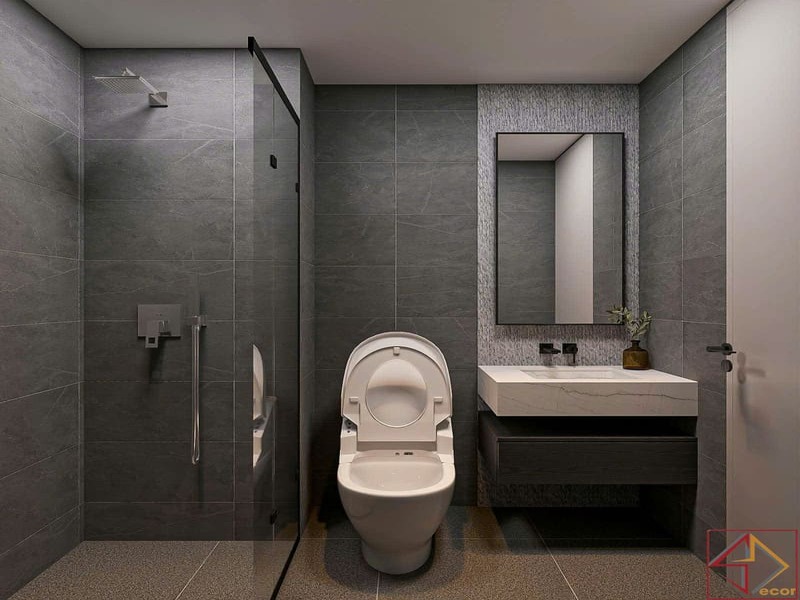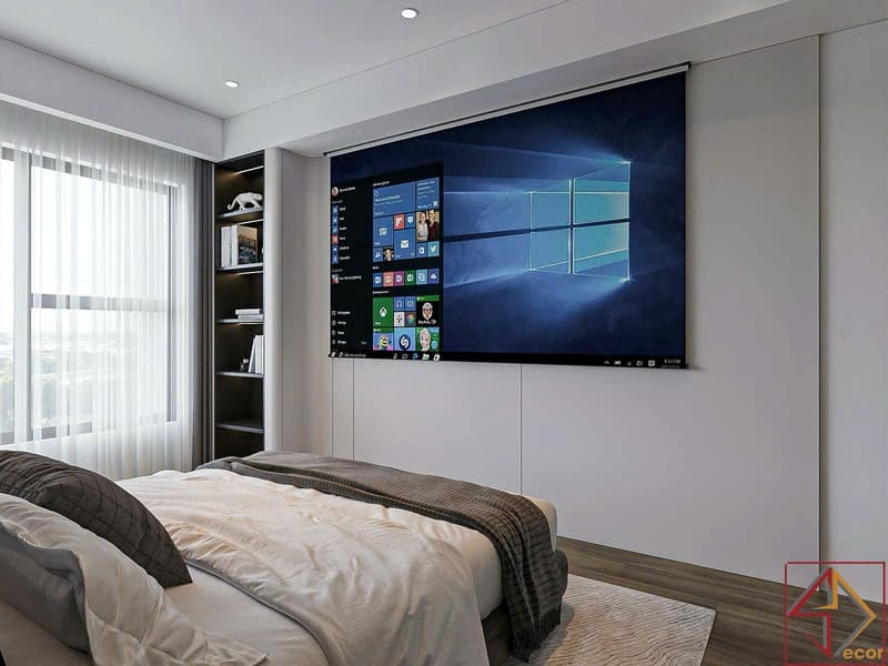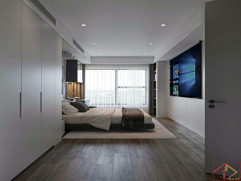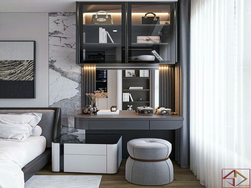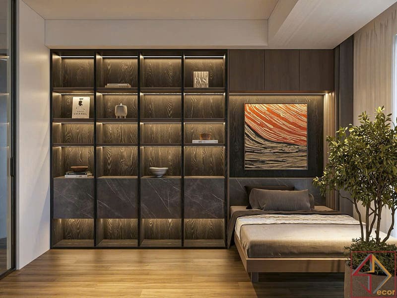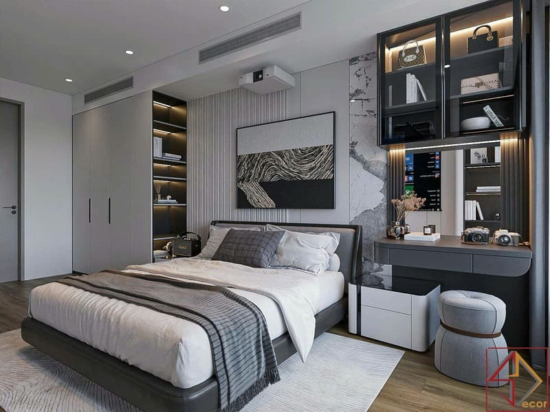 • Thiết kế thông minh: Kệ tủ âm tường trong phòng khách và phòng ngủ không chỉ tăng không gian lưu trữ mà còn tạo điểm nhấn trang trí. Việc sử dụng vách kính phân chia khu vực làm việc/học tập vừa đảm bảo sự riêng tư tương đối, vừa giữ được sự thông thoáng và kết nối thị giác giữa các không gian.