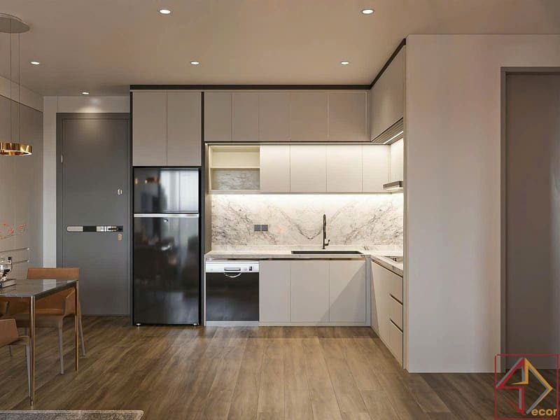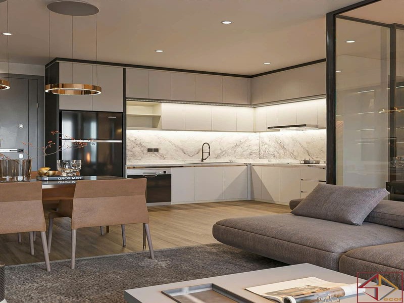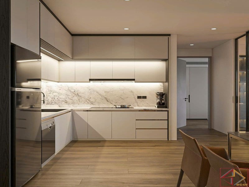 • Ánh sáng: Hệ thống chiếu sáng được thiết kế tỉ mỉ, bao gồm đèn âm trần downlight, đèn hắt sáng dưới kệ bếp và trong các hốc tủ. Việc sử dụng ánh sáng vàng ấm tạo cảm giác ấm cúng, sang trọng và thư giãn. Đèn hắt sáng không chỉ có chức năng chiếu sáng mà còn tạo hiệu ứng thị giác, làm nổi bật các bề mặt vật liệu và kiến trúc, đồng thời tạo ra các lớp ánh sáng khác nhau, tăng tính chiều sâu cho không gian.