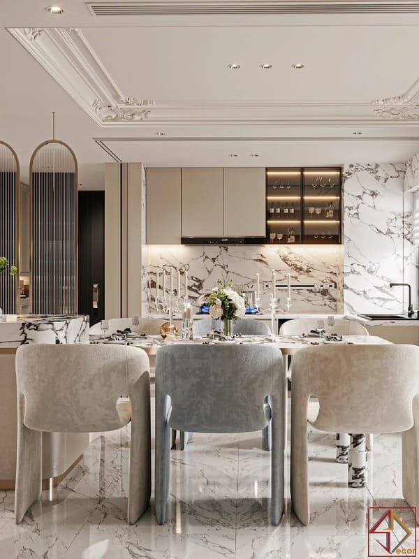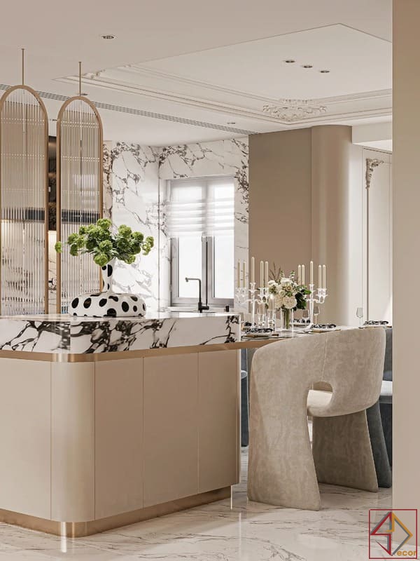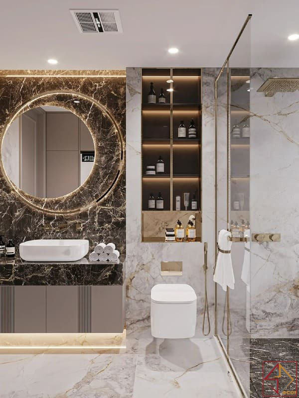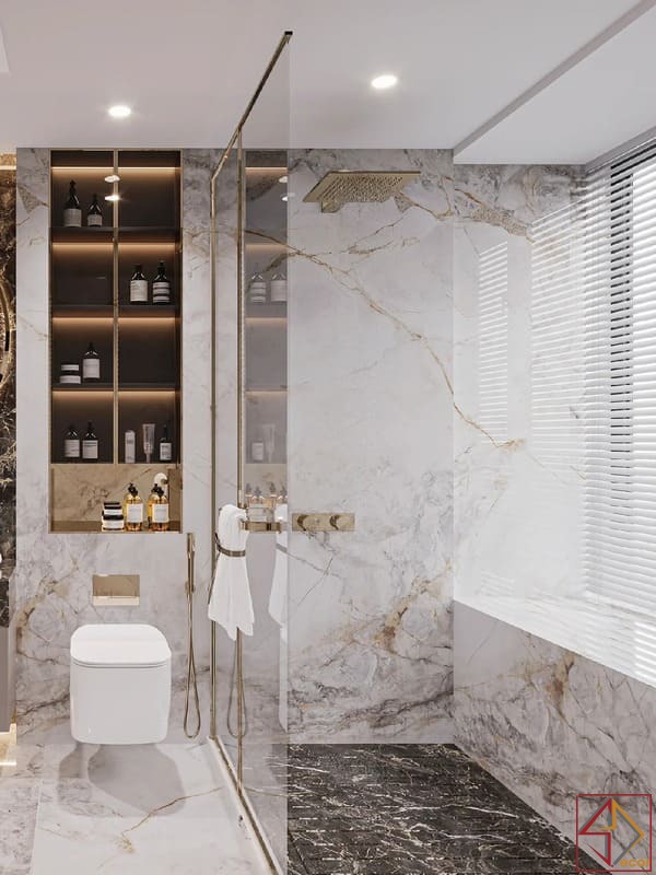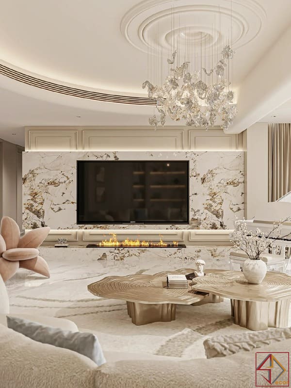 • Vật liệu cao cấp: Đá Marble với những đường vân tự nhiên và các chi tiết kim loại mạ vàng được kết hợp tinh tế, mang lại vẻ đẹp sang trọng, đẳng cấp.