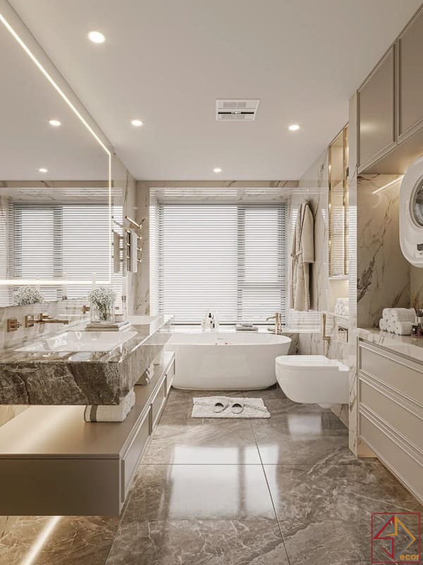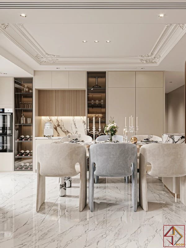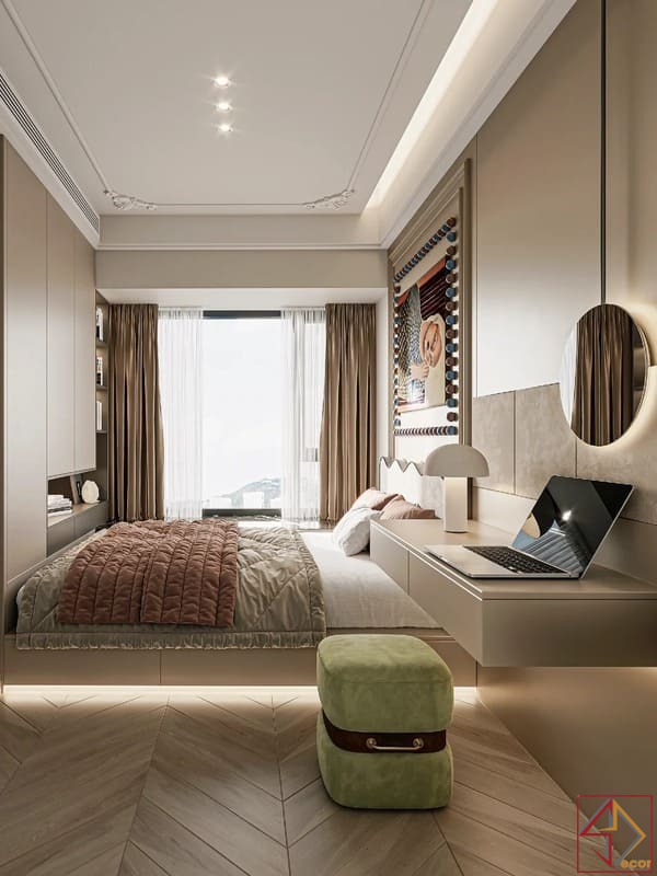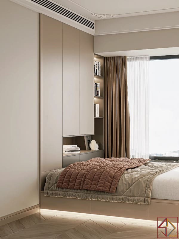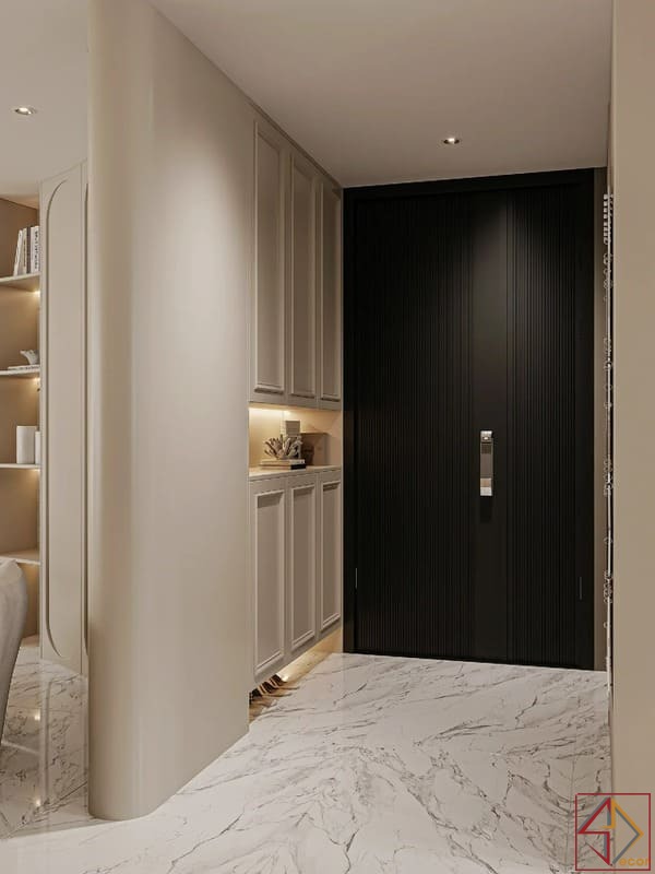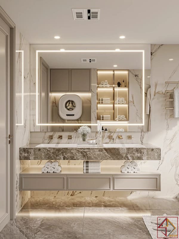 • Gam màu chủ đạo: Sử dụng tông kem, be và trắng làm nền, tạo cảm giác rộng rãi và thanh lịch.