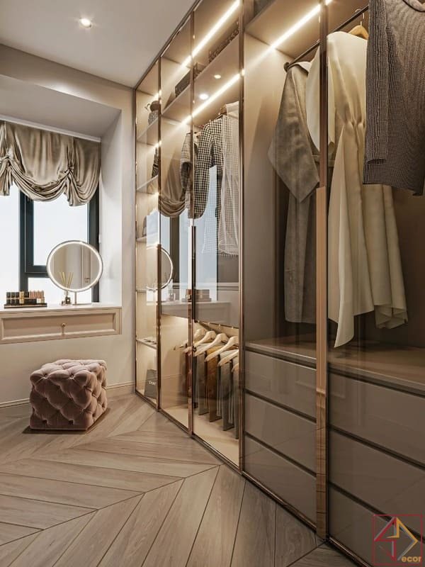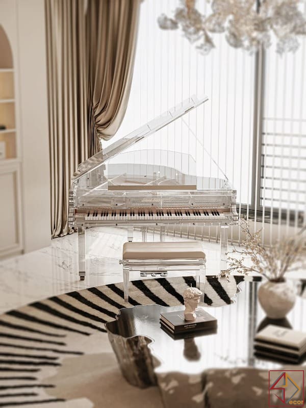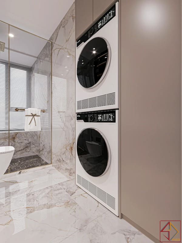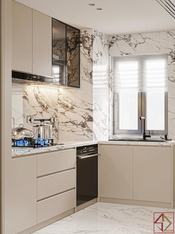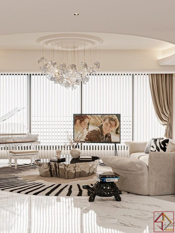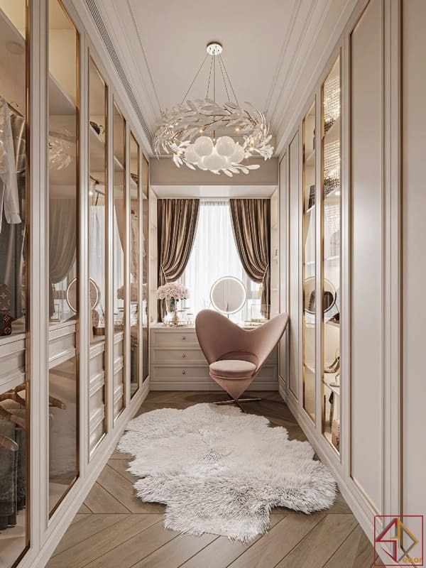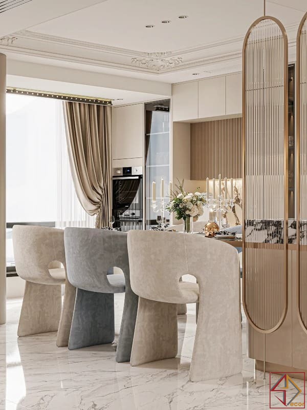 • Gam màu chủ đạo: Sử dụng tông kem, be và trắng làm nền, tạo cảm giác rộng rãi và thanh lịch.