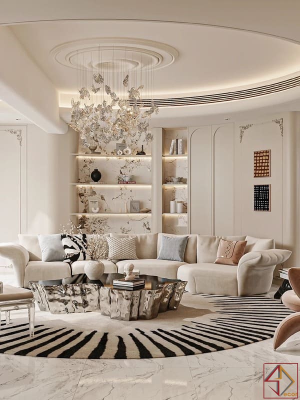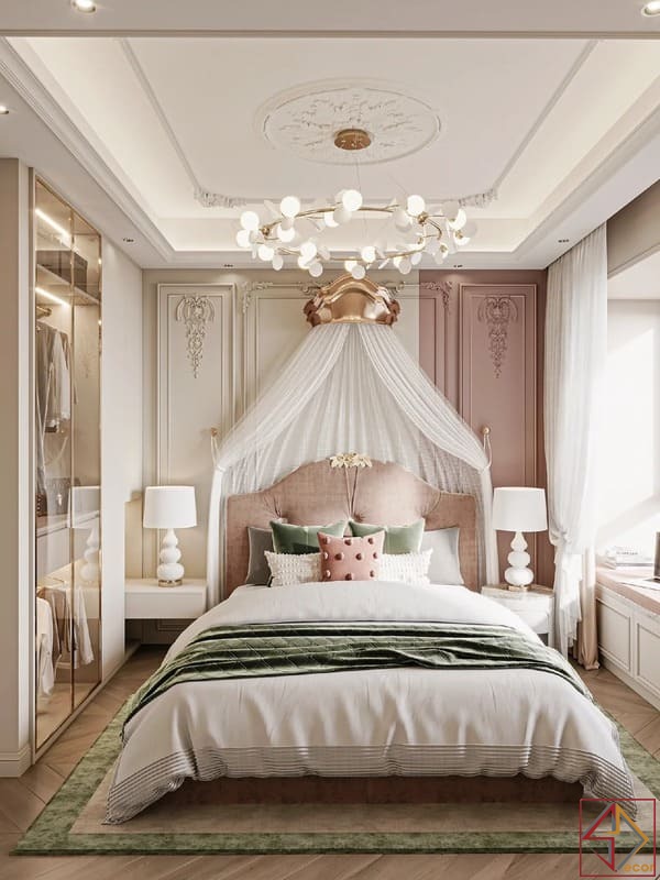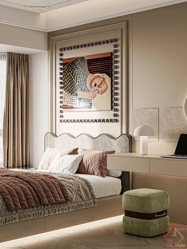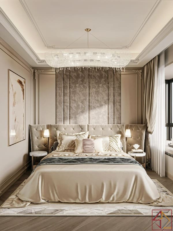 • Họa tiết và đường nét: Phào chỉ tinh xảo cùng những đường cong mềm mại ở trần nhà, sofa, và đầu giường tạo nên sự hài hòa, quý phái.