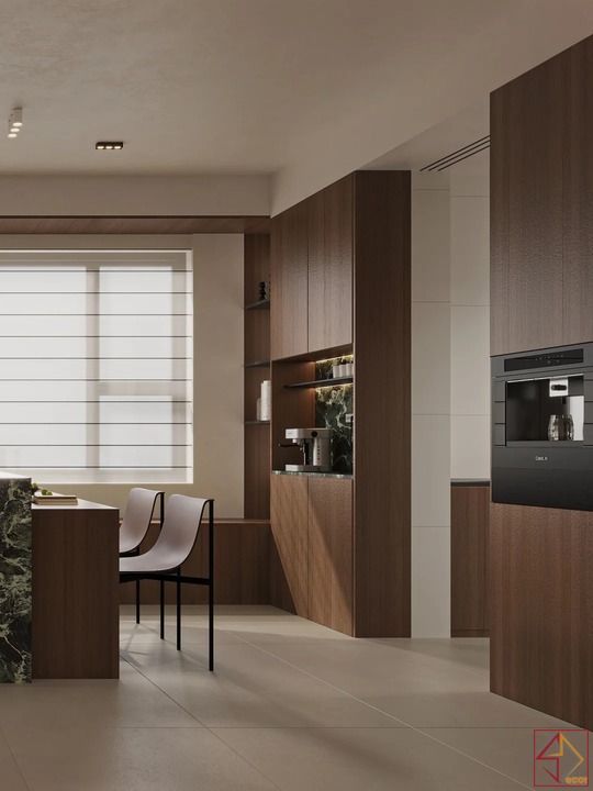 • Vật liệu cao cấp: Ưu tiên các loại vật liệu hiện đại như gỗ công nghiệp (veneer, melamine), kính, kim loại và đá tự nhiên.