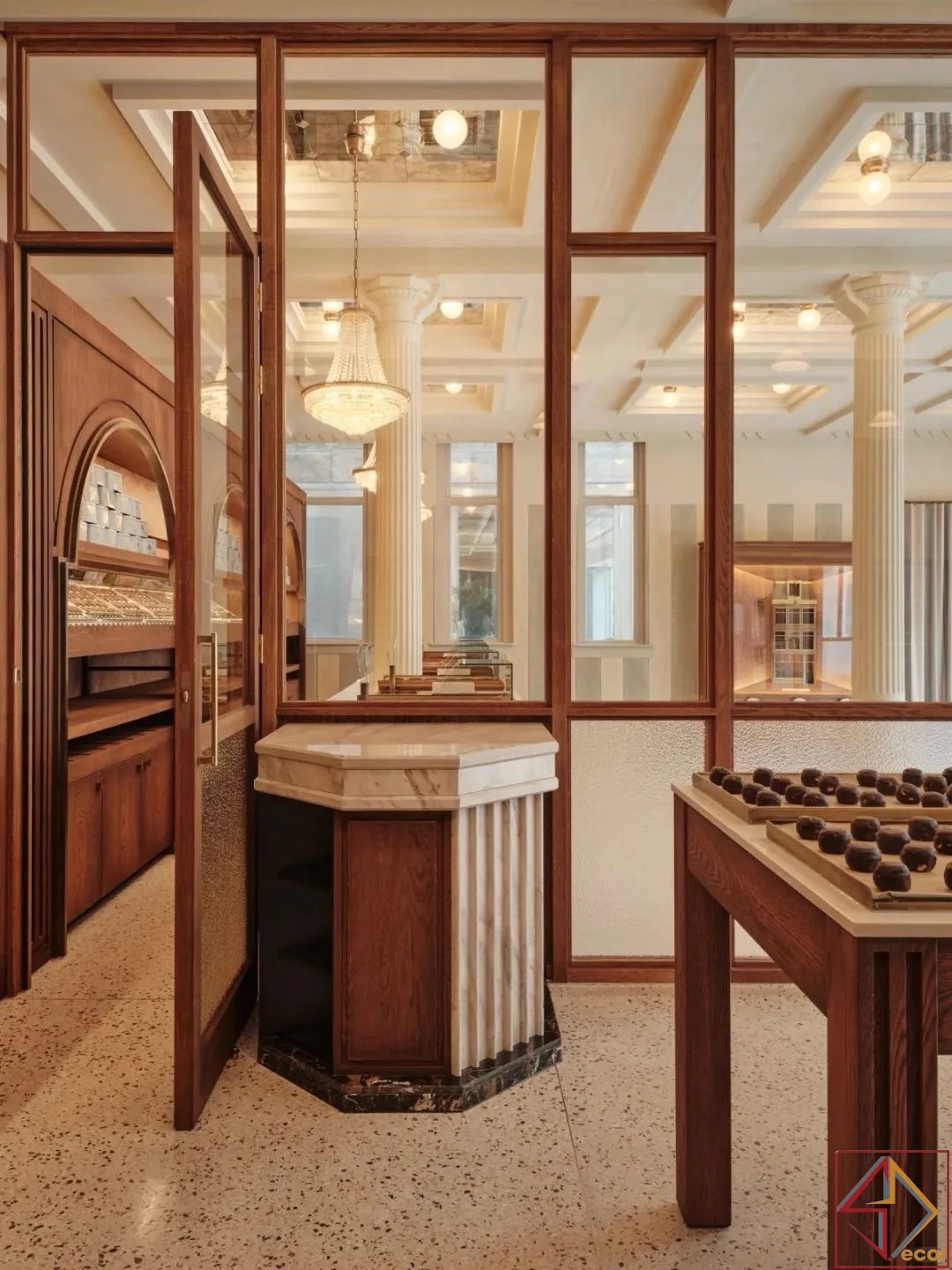 Phối màu chủ đạo xoay quanh tông nâu ấm của gỗ, trắng kem và xám của đá cẩm thạch và cột, cùng các điểm nhấn kim loại vàng/đồng. Bảng màu cổ điển, thanh lịch tạo cảm giác sang trọng