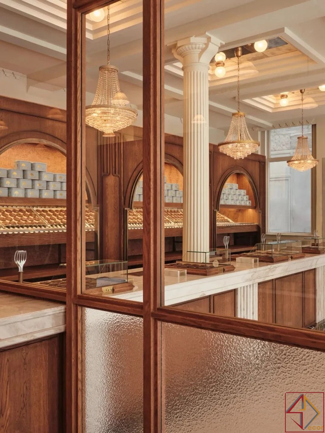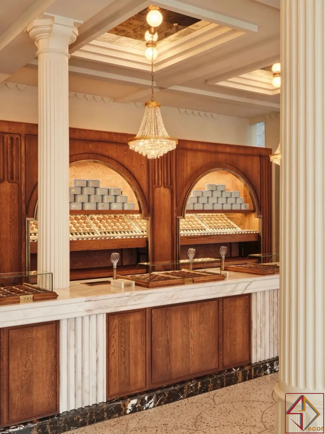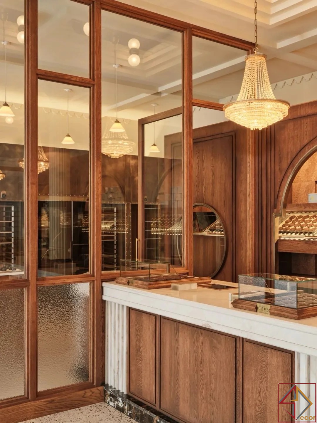 Điểm Nhấn Đồng/Vàng: Các điểm nhấn kim loại tinh tế, có thể là đồng hoặc vàng, có thể được nhìn thấy trong các thiết bị chiếu sáng và có thể là một số yếu tố trưng bày, tăng thêm cảm giác sang trọng.
