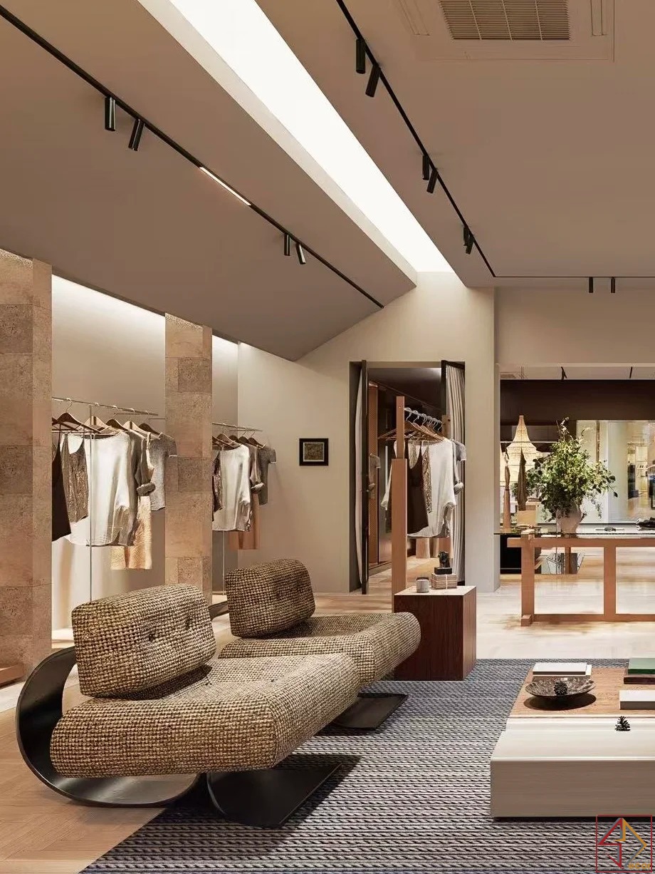 Không gian trải nghiệm cao cấp: Bố trí sofa, ghế bành và bàn cà phê, tạo không gian thư giãn, thoải mái cho khách hàng. Tích hợp tranh lớn và vật dụng trang trí độc đáo, nâng tầm thẩm mỹ không gian.