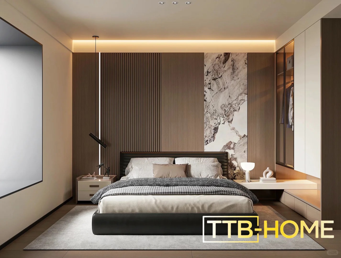 • Phòng ngủ sử dụng tông nâu – kem nhẹ nhàng, mang lại cảm giác yên bình, dễ chịu.