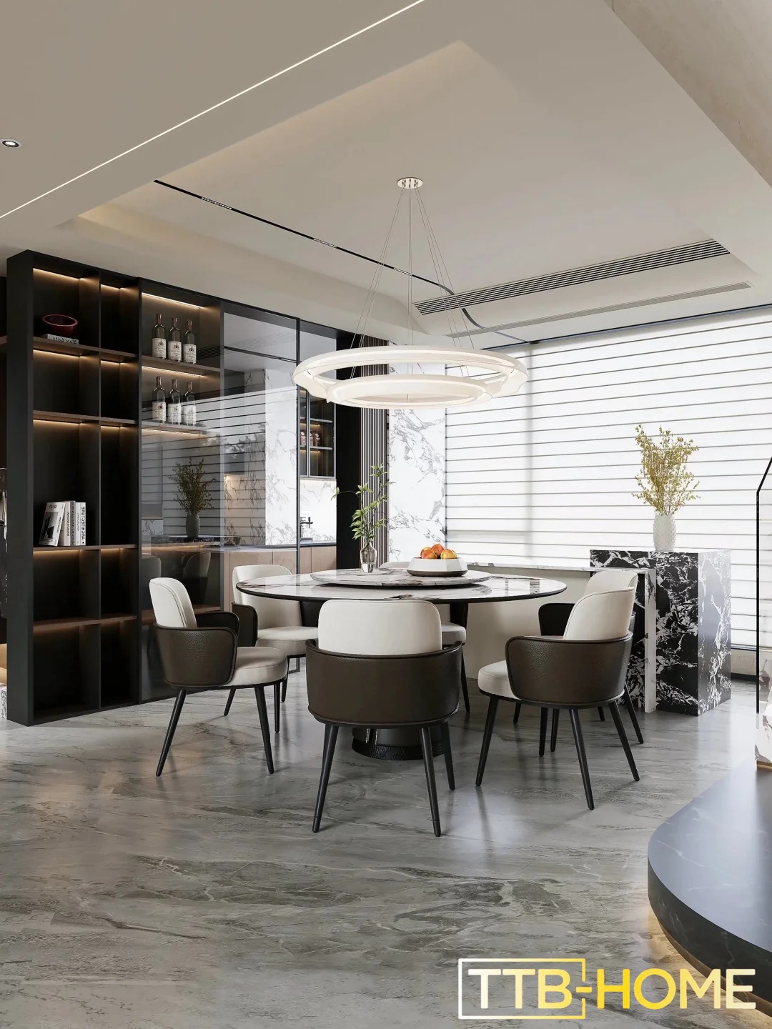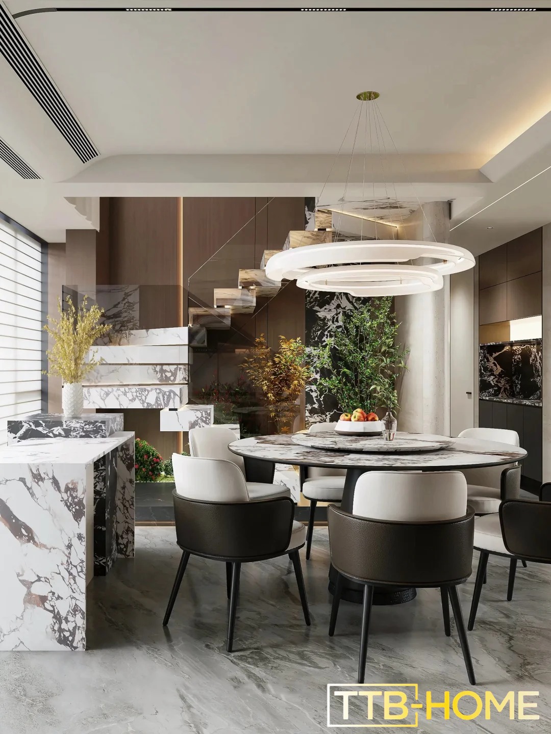 • Khu bếp và phòng ăn bố trí liền kề, tiện nghi, kết hợp bàn ăn tròn marble cho cảm giác quây quần, ấm áp.
