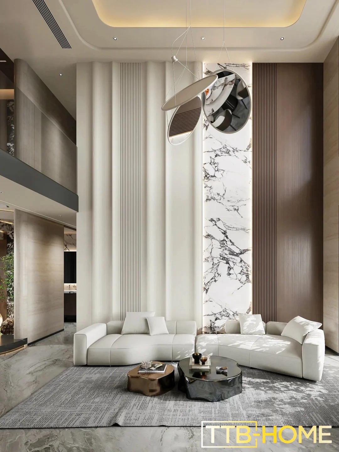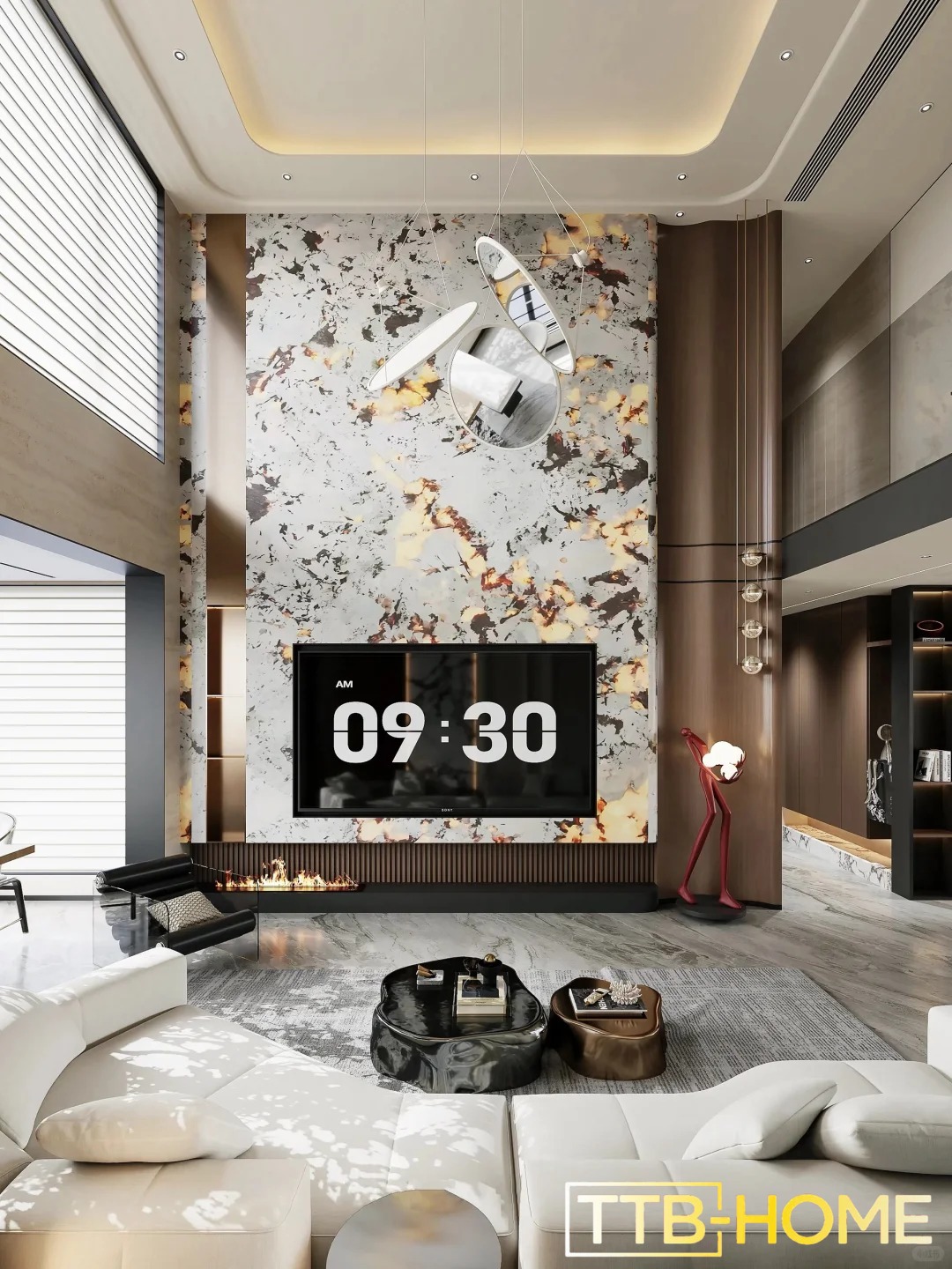 • Tường ốp gỗ và đá marble vân mây, tạo chiều sâu và cảm giác sang trọng.