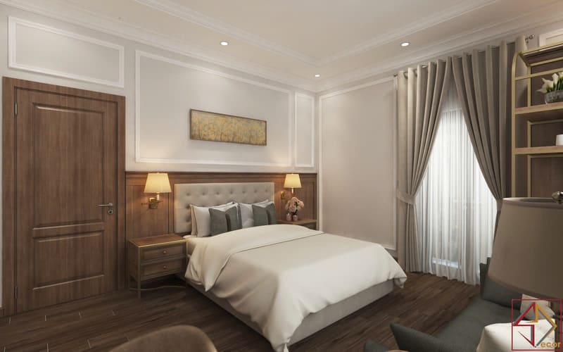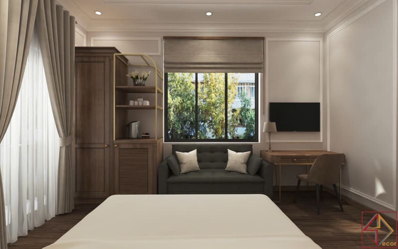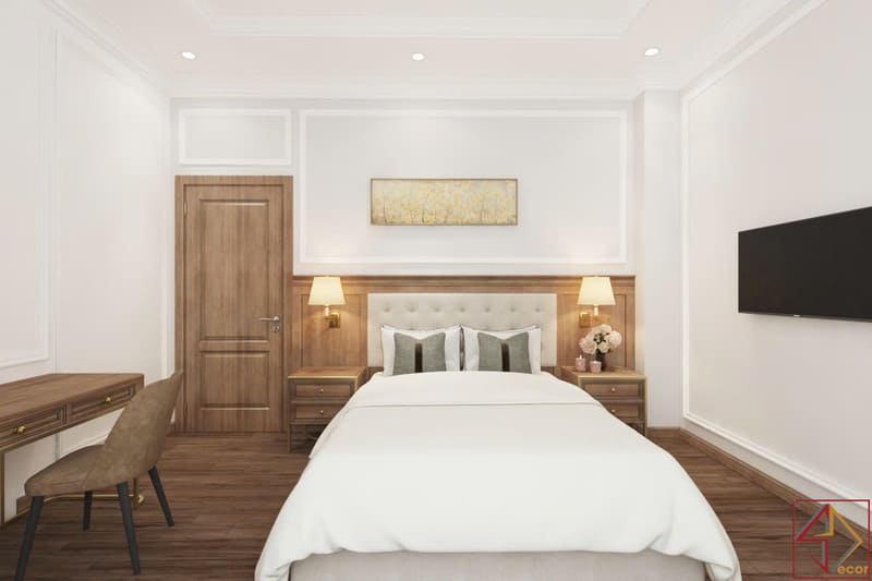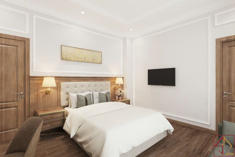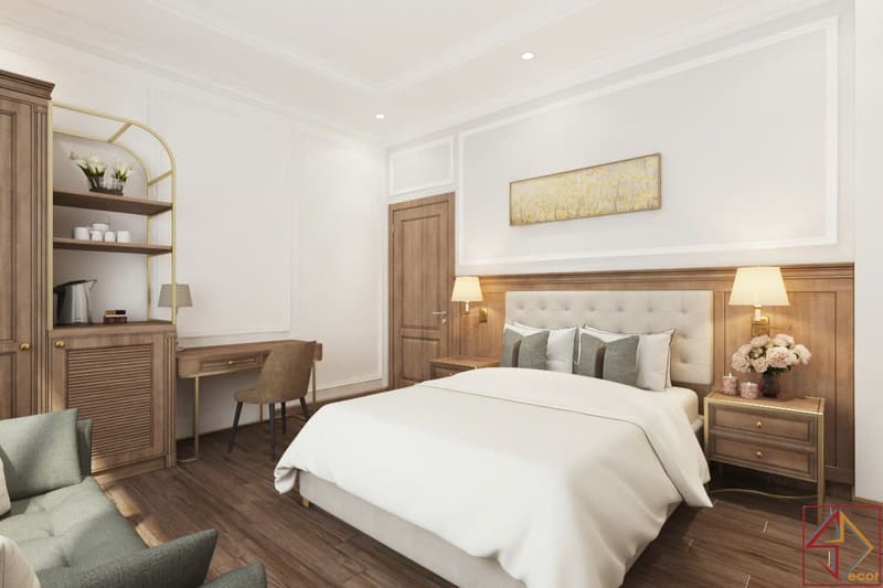 • Màu sắc: Kết hợp màu sáng (trắng/kem) và màu ấm (nâu gỗ, vàng đồng). Bảng màu này tạo cảm giác thanh bình, thư thái nhưng vẫn sang trọng, gợi nhớ đến kiến trúc cổ điển hiện đại.