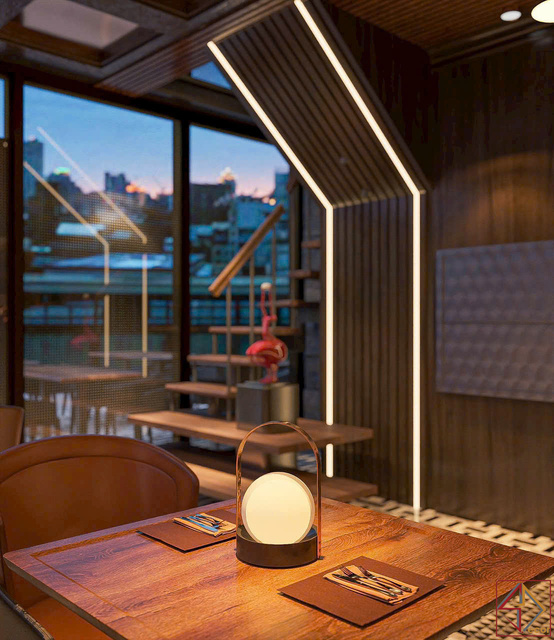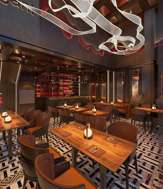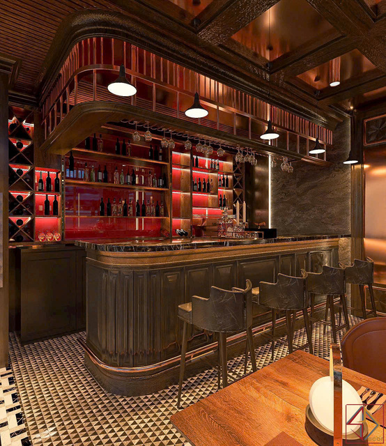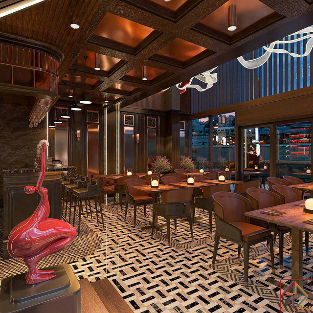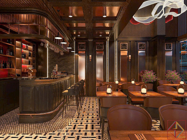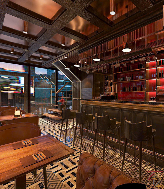 Bài trí nội thất: Kết hợp bàn ghế tiêu chuẩn và sofa dài, tối ưu không gian và sự thoải mái. Bố cục mở, thông thoáng nhưng vẫn có sự phân chia tinh tế bằng cây xanh. Quầy bar hoành tráng, là trung tâm thu hút.