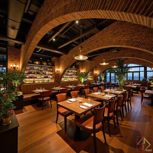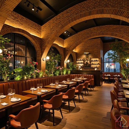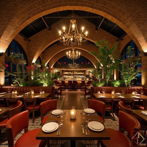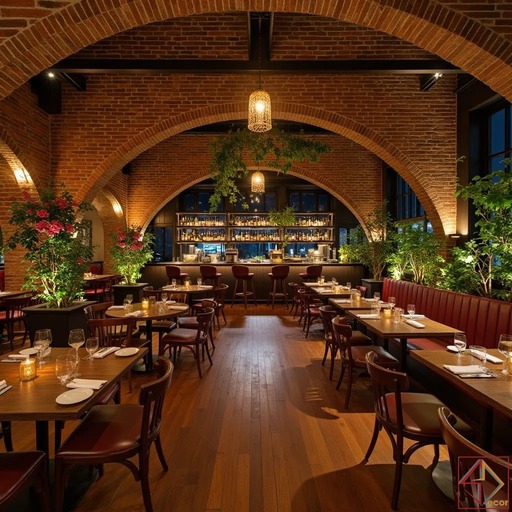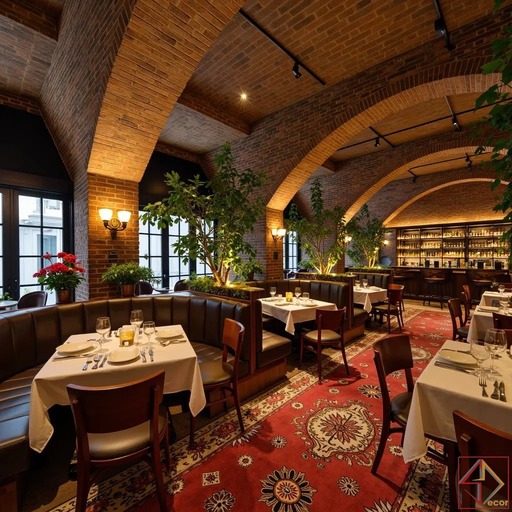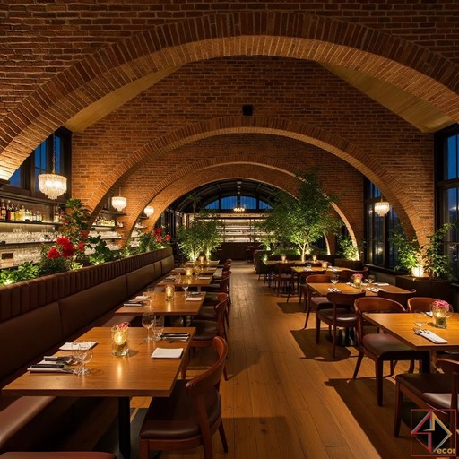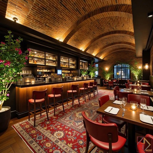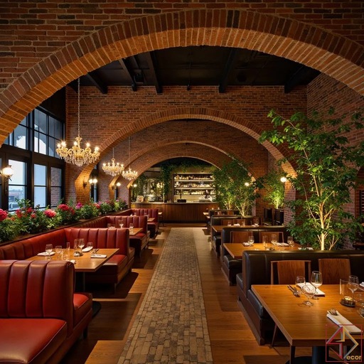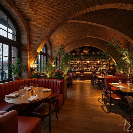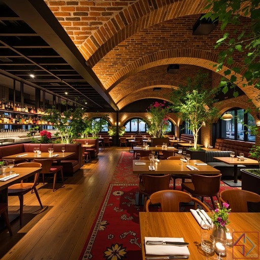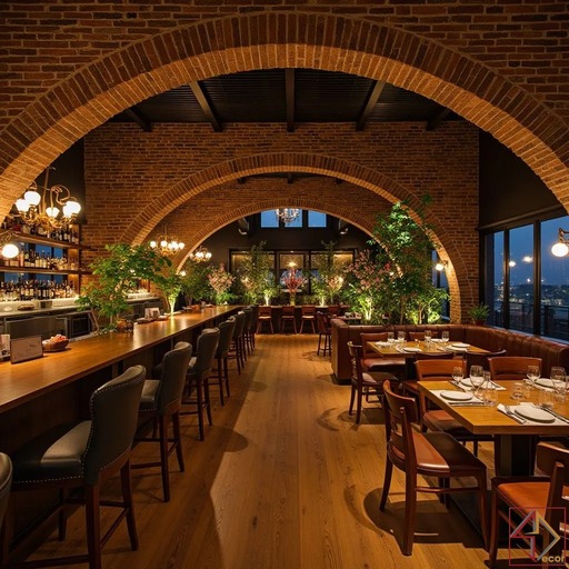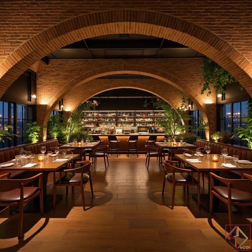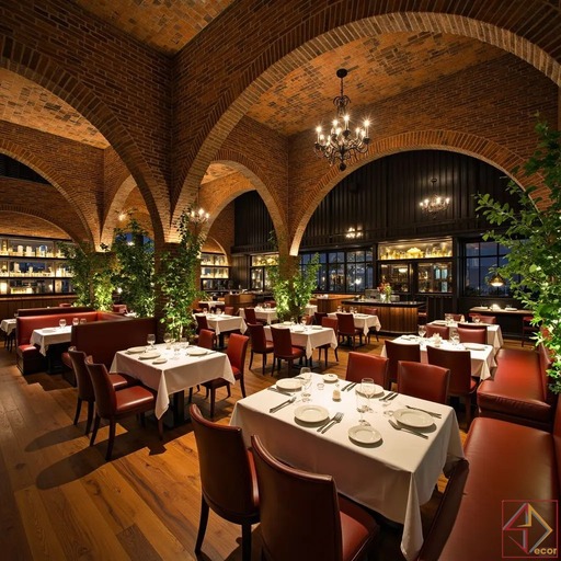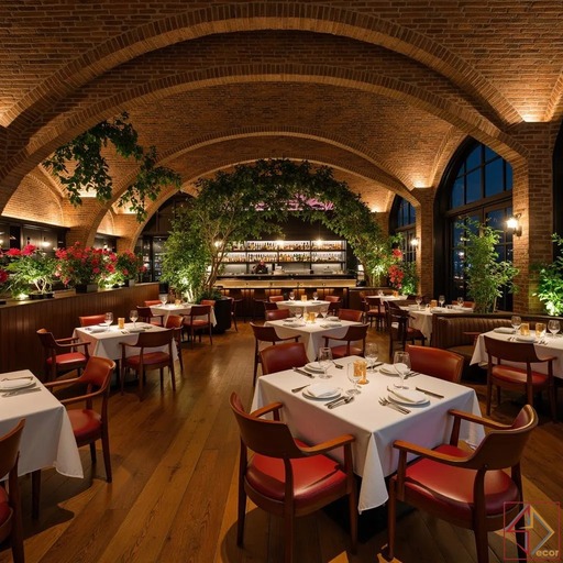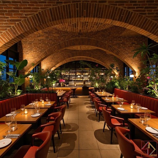 Kiến trúc tổng thể và cấu trúc: Yếu tố nổi bật nhất và mang tính biểu tượng của không gian này là việc sử dụng rộng rãi các vòm gạch trần tạo chiều sâu và sự hoành tráng, tạo ra một cảm giác bao bọc, gần gũi và ấm cúng, không hề bị trống trải. Đây là một cấu trúc kiến trúc truyền thống, gợi nhớ đến các hầm rượu vang cổ điển, nhà máy cũ hoặc các công trình kiến trúc châu Âu lịch sử.