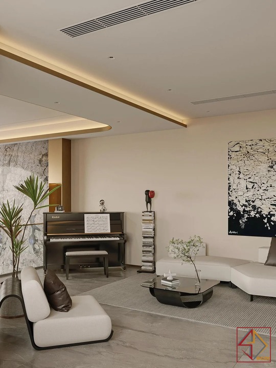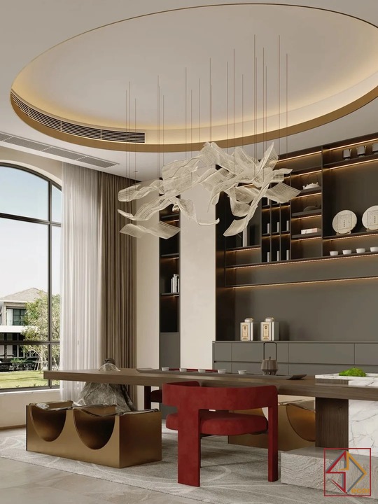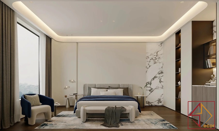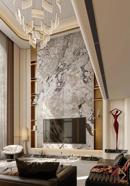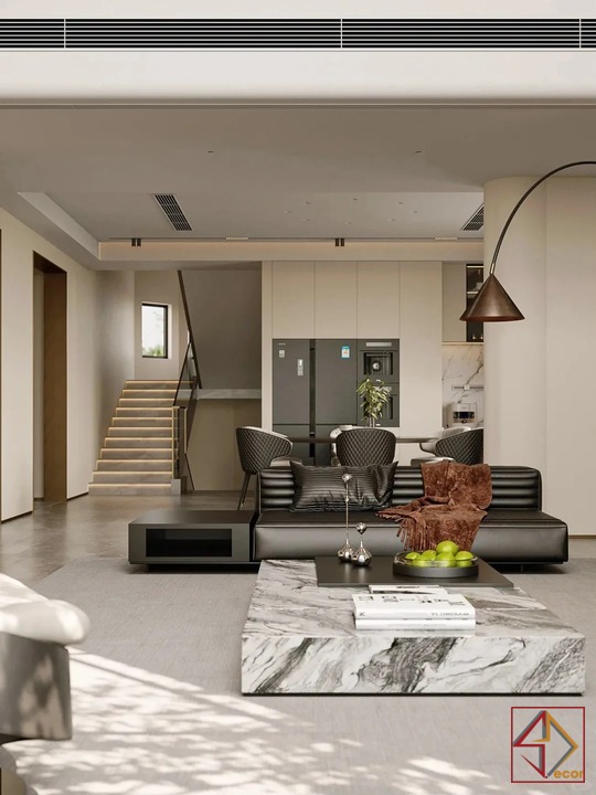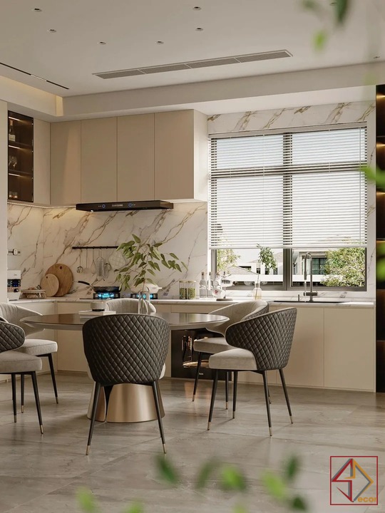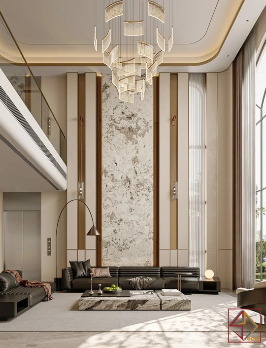 Thiết kế này là sự kết hợp hoàn hảo giữa phong cách hiện đại phóng khoáng và những chi tiết Luxury cao cấp. Gam màu trung tính như be, xám và trắng được sử dụng làm nền, tạo cảm giác nhẹ nhàng, thanh lịch. Các vật liệu đắt giá như đá marble vân mây, gỗ óc chó. Và kim loại mạ đồng được khéo léo lồng ghép, mang đến vẻ đẹp sang trọng vượt thời gian.