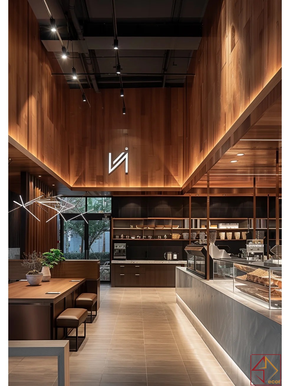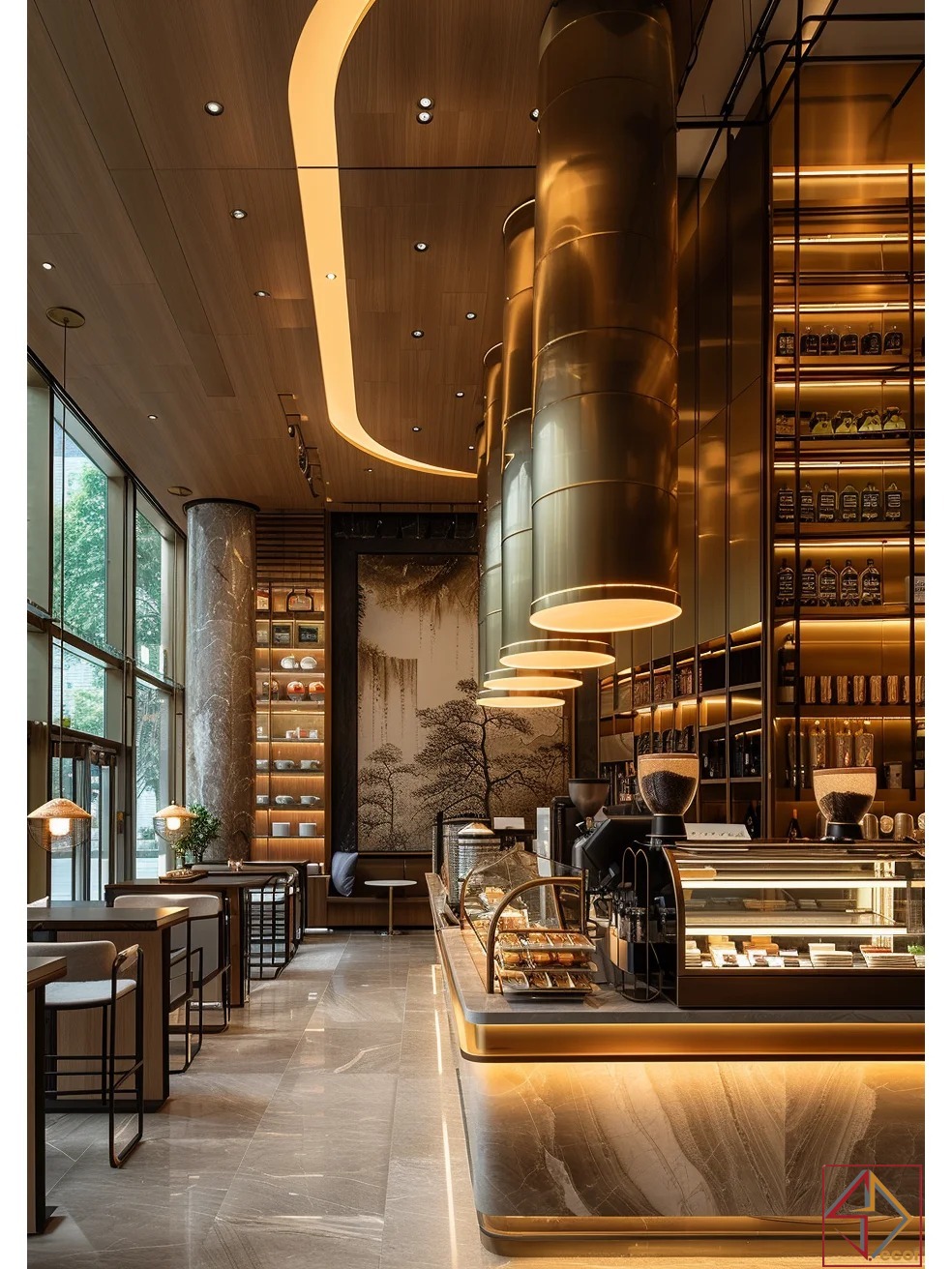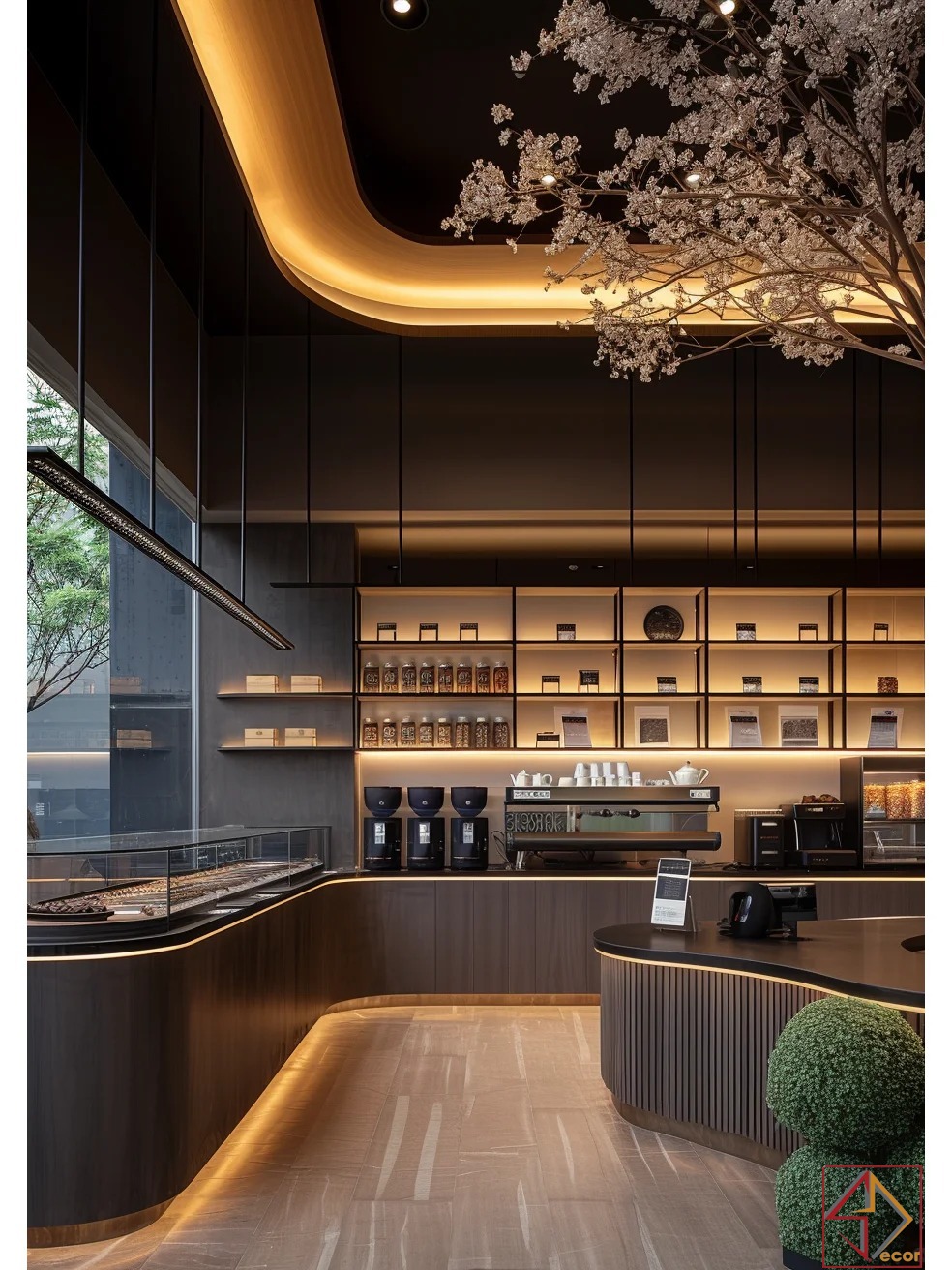 Ánh sáng tinh tế: Tối ưu ánh sáng tự nhiên qua kính lớn. Đèn LED hắt sáng (dưới quầy, trần cong) tạo hiệu ứng nổi bật và không khí ấm cúng; đèn spotlight cung cấp ánh sáng chức năng.