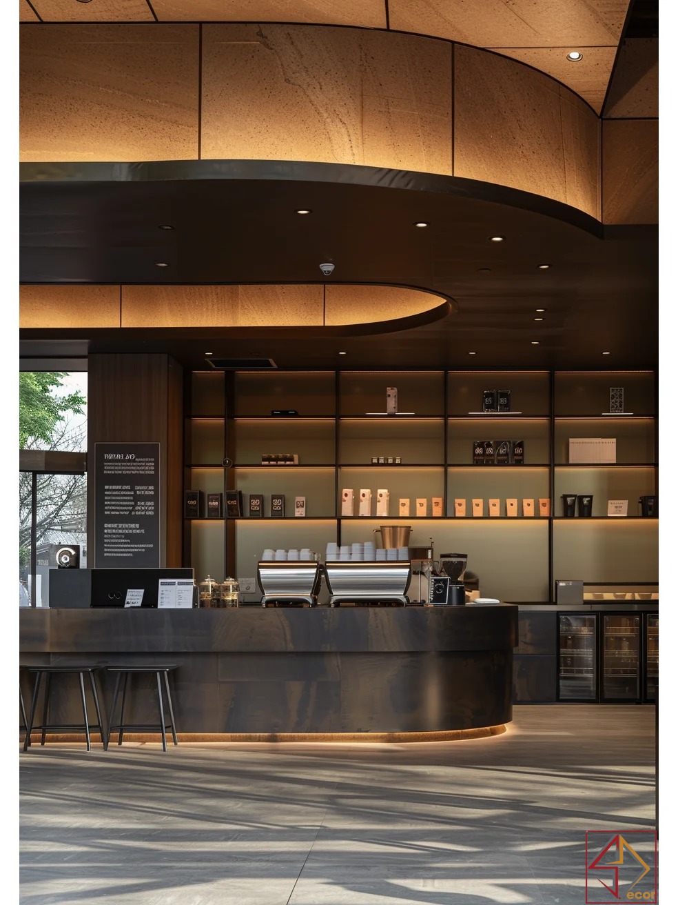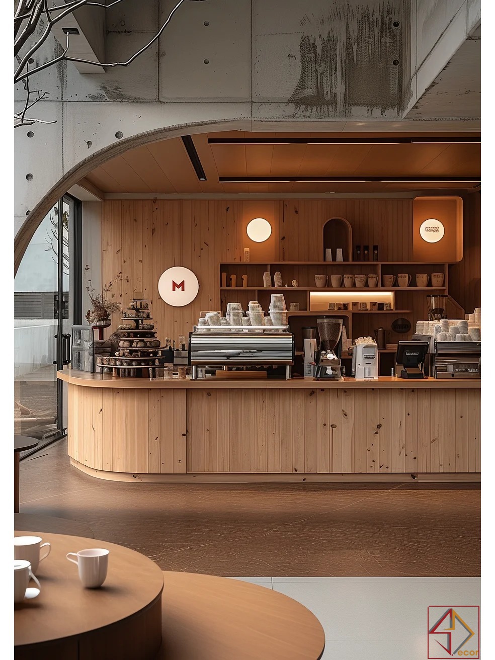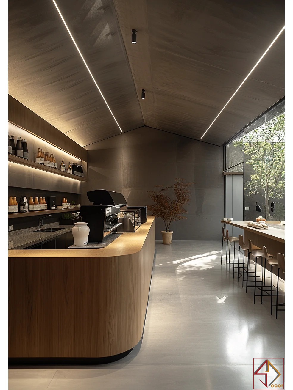 Đường nét mềm mại: Đường cong uốn lượn (quầy bar, trần, các chi tiết nội thất) làm mềm không gian, tạo cảm giác thân thiện và thanh thoát, cân bằng với các đường thẳng tối giản.