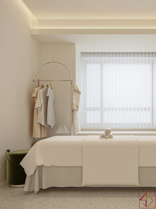 Trần nhà điêu khắc: Đây là điểm nhấn kiến trúc nổi bật và độc đáo nhất. Trần nhà không phẳng mà được tạo hình bằng các khối đa giác 3D, lồi lõm, hoặc các panel hình học phức tạp, tạo nên một “bầu trời” có kết cấu và chiều sâu đáng kinh ngạc.